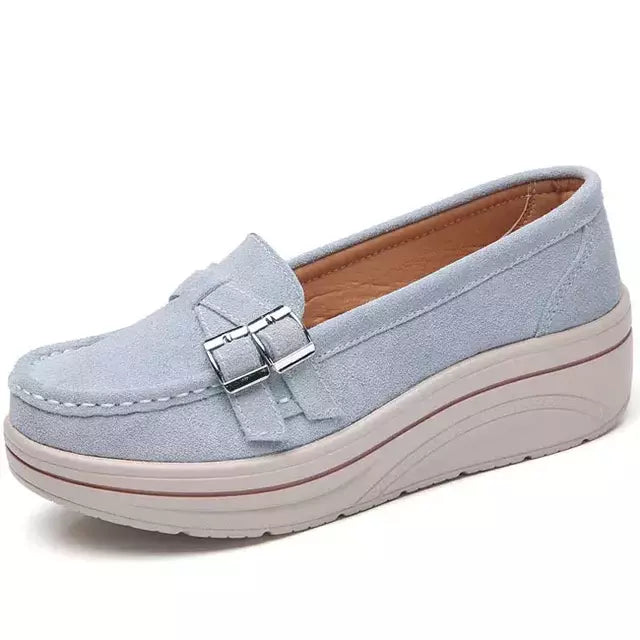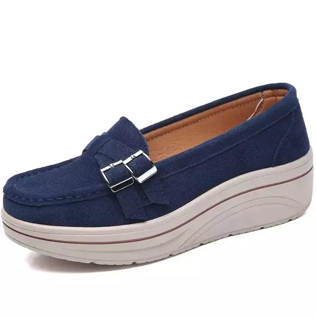 Con un elegante tacón de 5 cm, este mocasín no solo eleva la estatura, sino que también ofrece un diseño sofisticado y moderno. El tacón proporciona un soporte adicional al arco del pie, ayudando a mantener la postura correcta y distribuyendo el peso de manera equilibrada, lo cual es esencial para la salud de los pies y la columna.